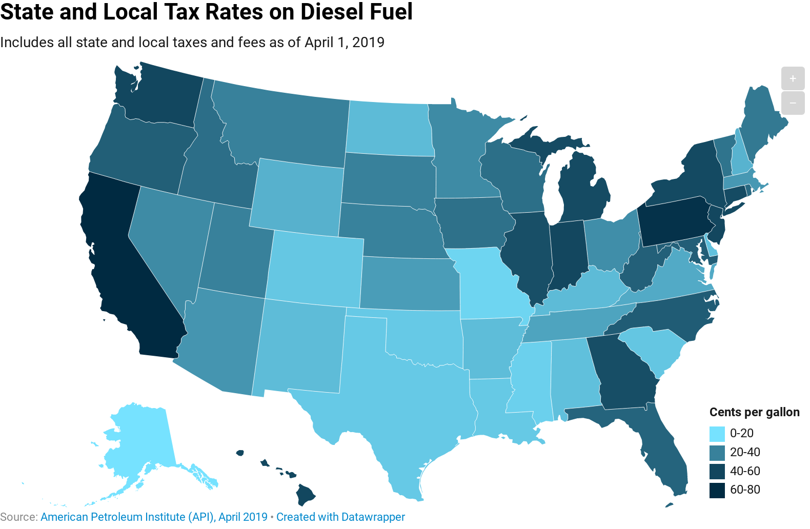The tax rates identified in this map include state and local excise and sales taxes on diesel fuel, as well as various fees, as calculated by the American Petroleum Institute (API). These taxes are levied in addition to the federal government’s 24.4-cent-per-gallon diesel tax.