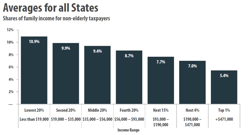 • State consumption tax structures are highly regressive with an average 7 percent rate on sales and excise taxes for the poor, a 4.7 percent rate for middle-income people, and a 0.8 percent rate for the wealthiest taxpayers. Because food is one of the largest expenses for low-income families, taxing food is particularly regressive; five of the ten most regressive states tax food at the state or local level.