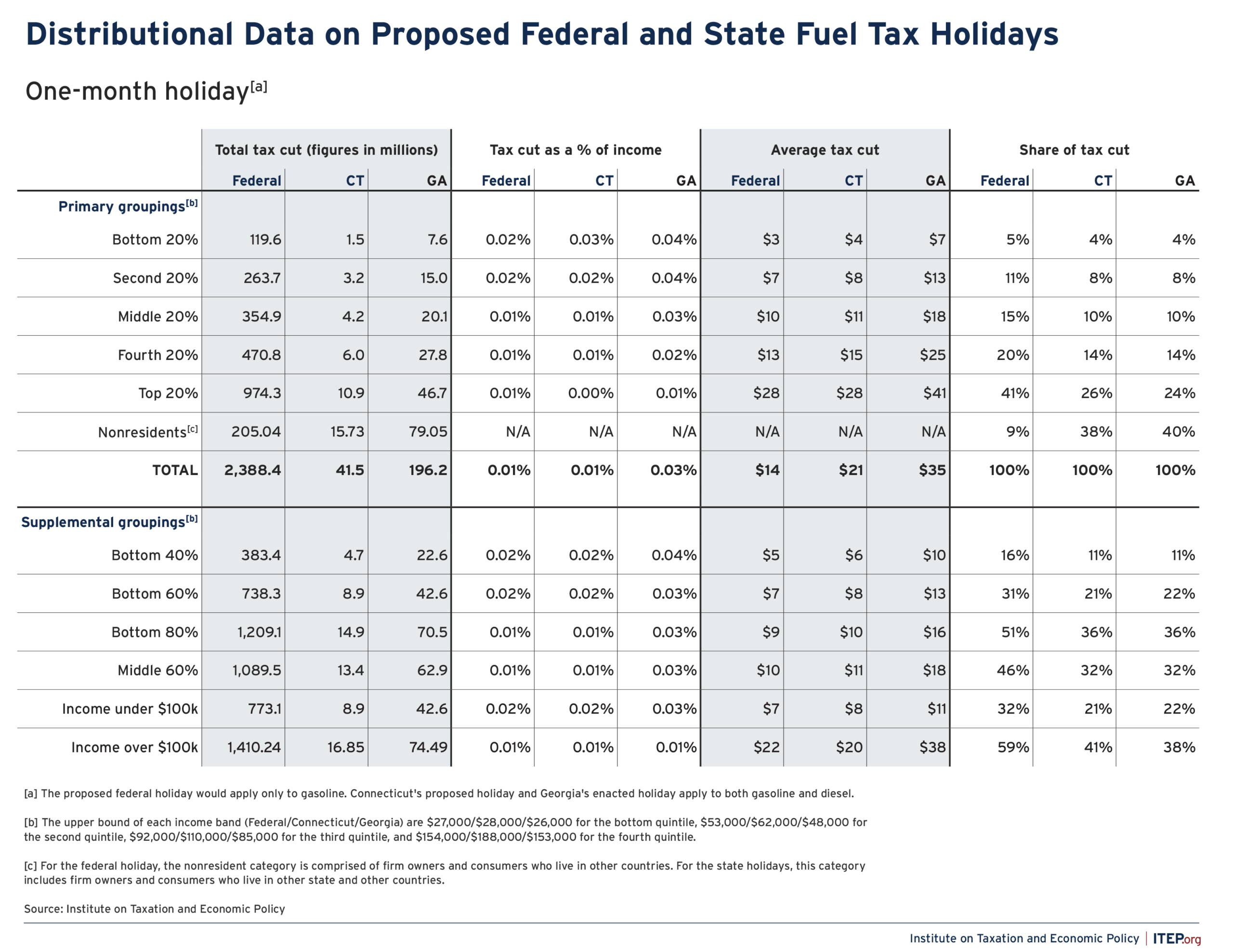 - State gas tax holidays will help corporations and visitors far more than those having a hard time paying for gas. In Georgia, a gas tax holiday recently enacted into law will cost $196 million per month and the bottom 60 percent of Georgia families will collect just 22 percent of the tax cuts—or $13 per family. Forty percent of the tax cut will flow to people who are not even residents of Georgia.