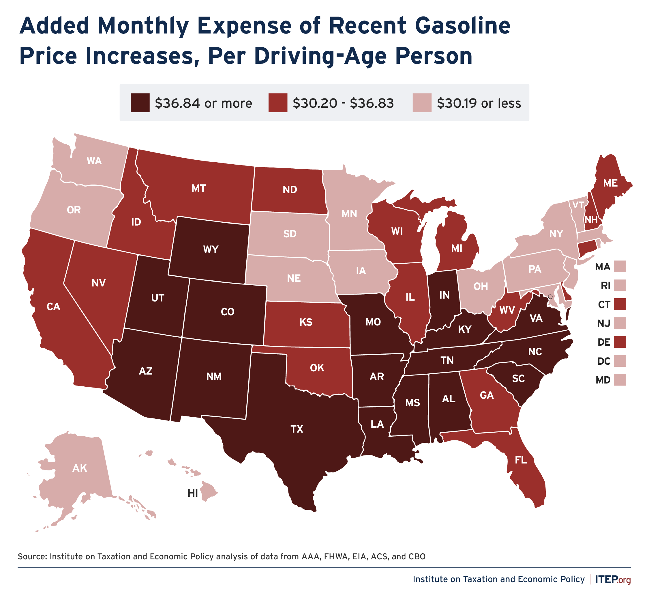 If current price increases are sustained, we find that the additional monthly expense is highest in Alabama ($52 per driving-age person), Mississippi ($51), Wyoming ($49), Kentucky ($47), and New Mexico ($44).