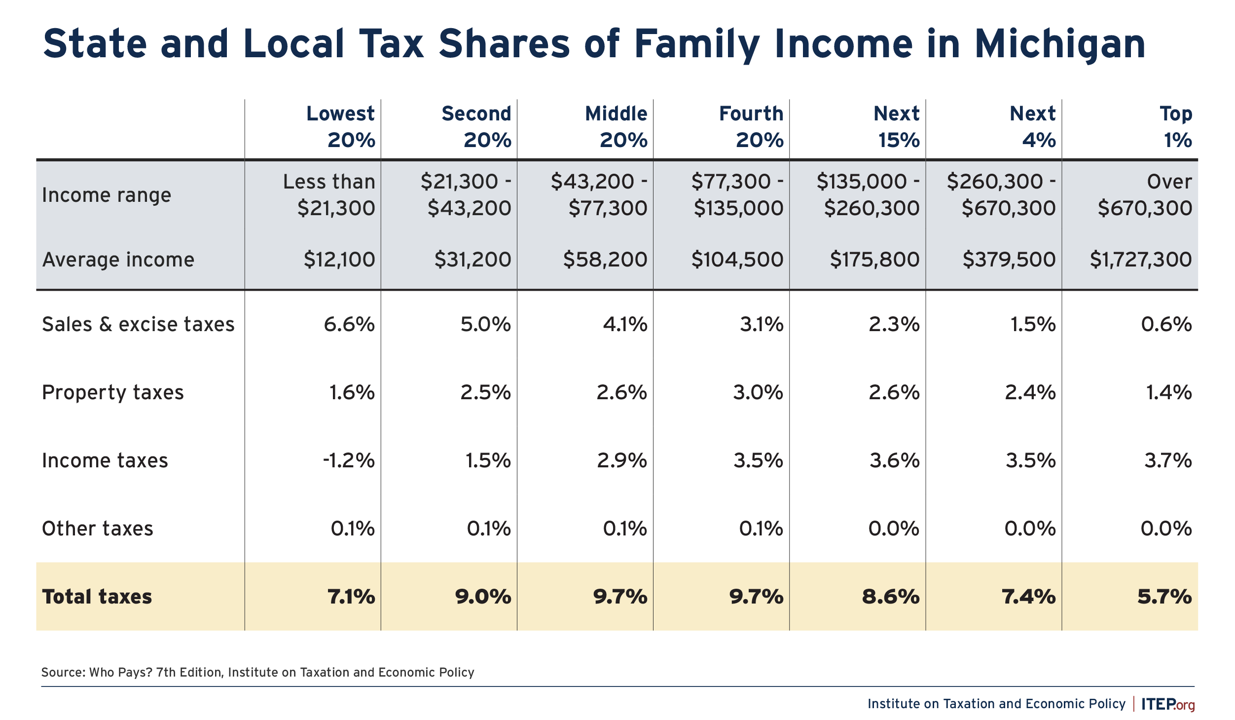 The top 1 percent of Michiganders, those with incomes over $670,300 per year, pay 5.7 percent of their income in state and local taxes—less than any other income group in the state. In comparison, the lowest 20 percent of Michiganders, those with annual incomes of less than $21,300, paid an average of 7.1 percent of their income towards Michigan taxes. The middle 20 percent (with annual incomes between $43,200 and $77,300) paid an average of 9.7 percent.