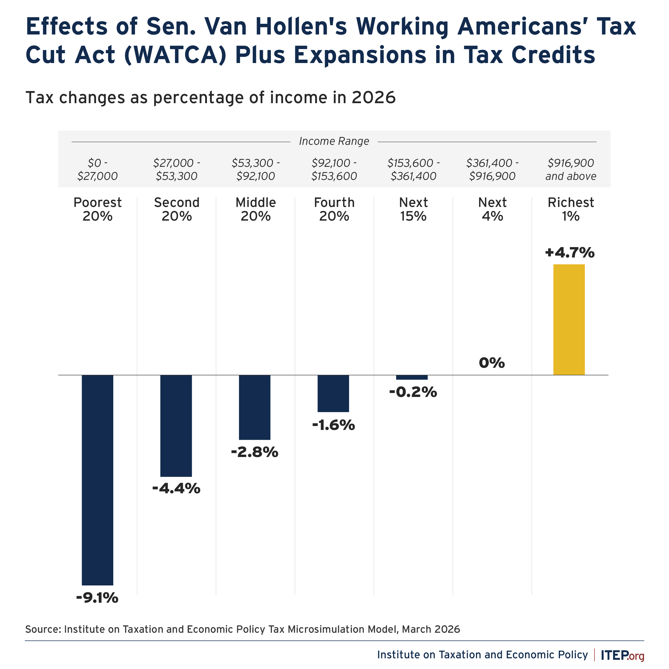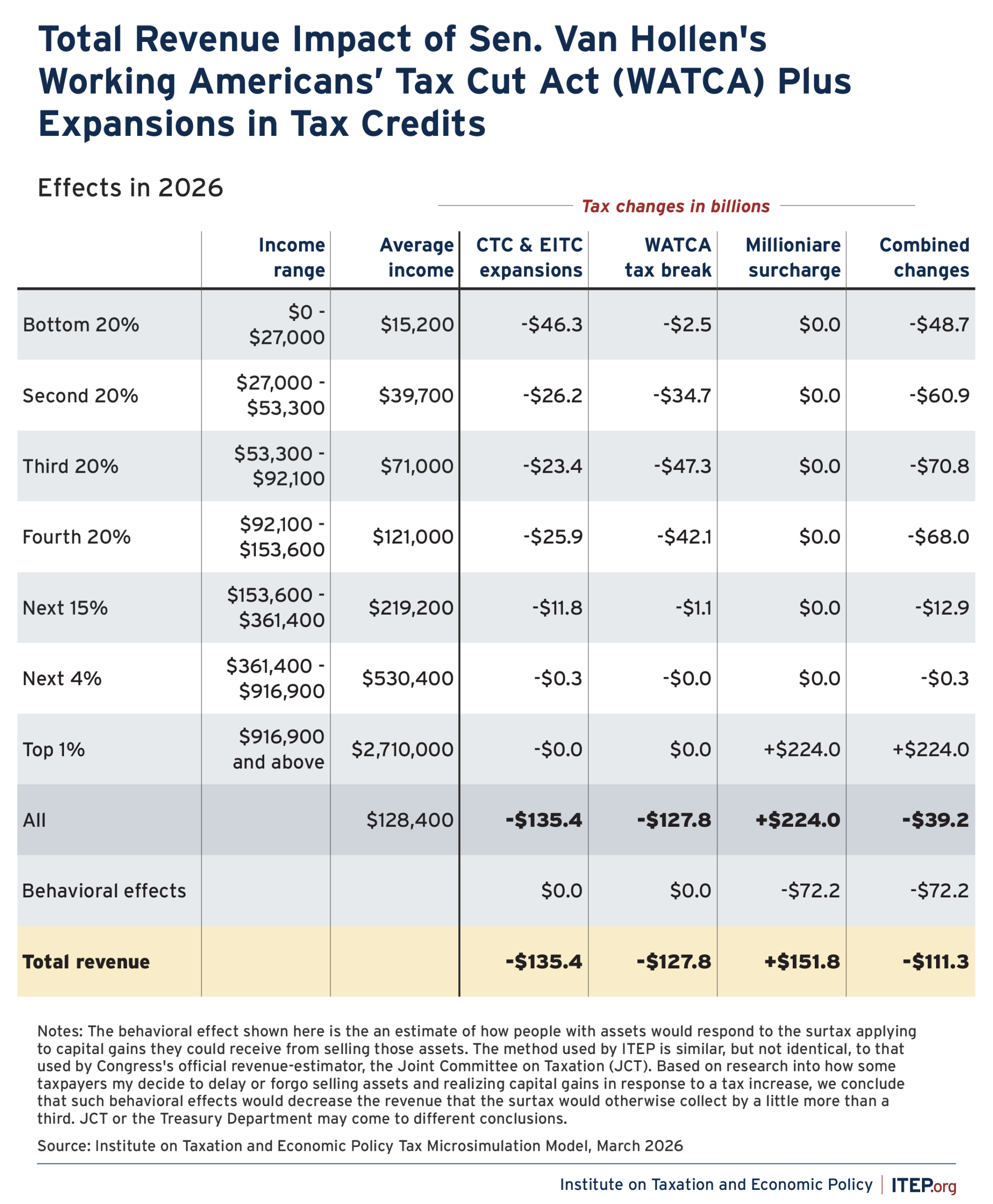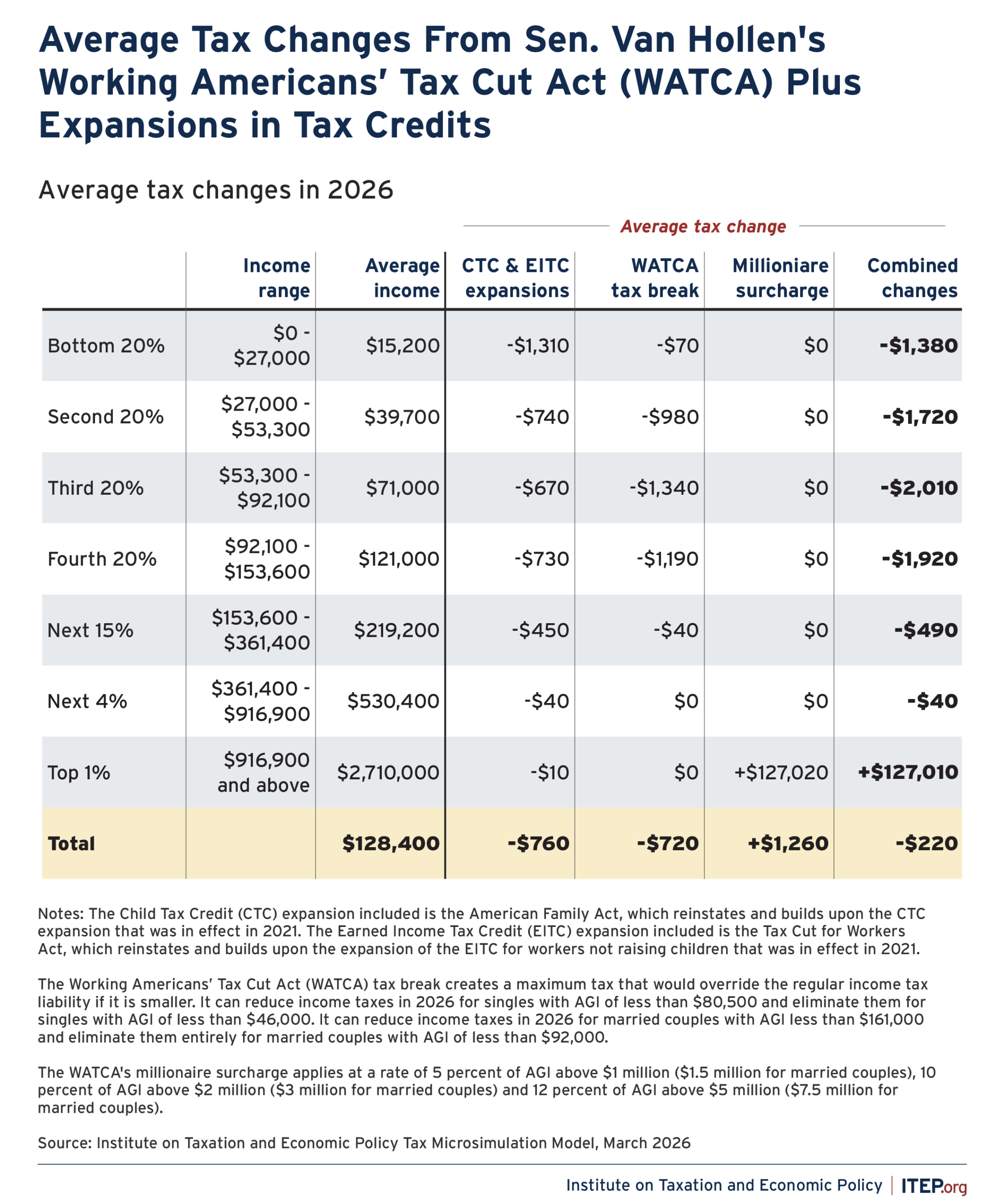In 2026, the combination of the WATCA’s tax reduction plus the CTC and EITC expansions would provide an average tax break ranging from nearly $1,400 to about $2,000 for the bottom four quintiles of taxpayers (the bottom 80 percent of taxpayers). The richest 1 percent would pay higher taxes on average as a result of the millionaire surcharge included in the WATCA.