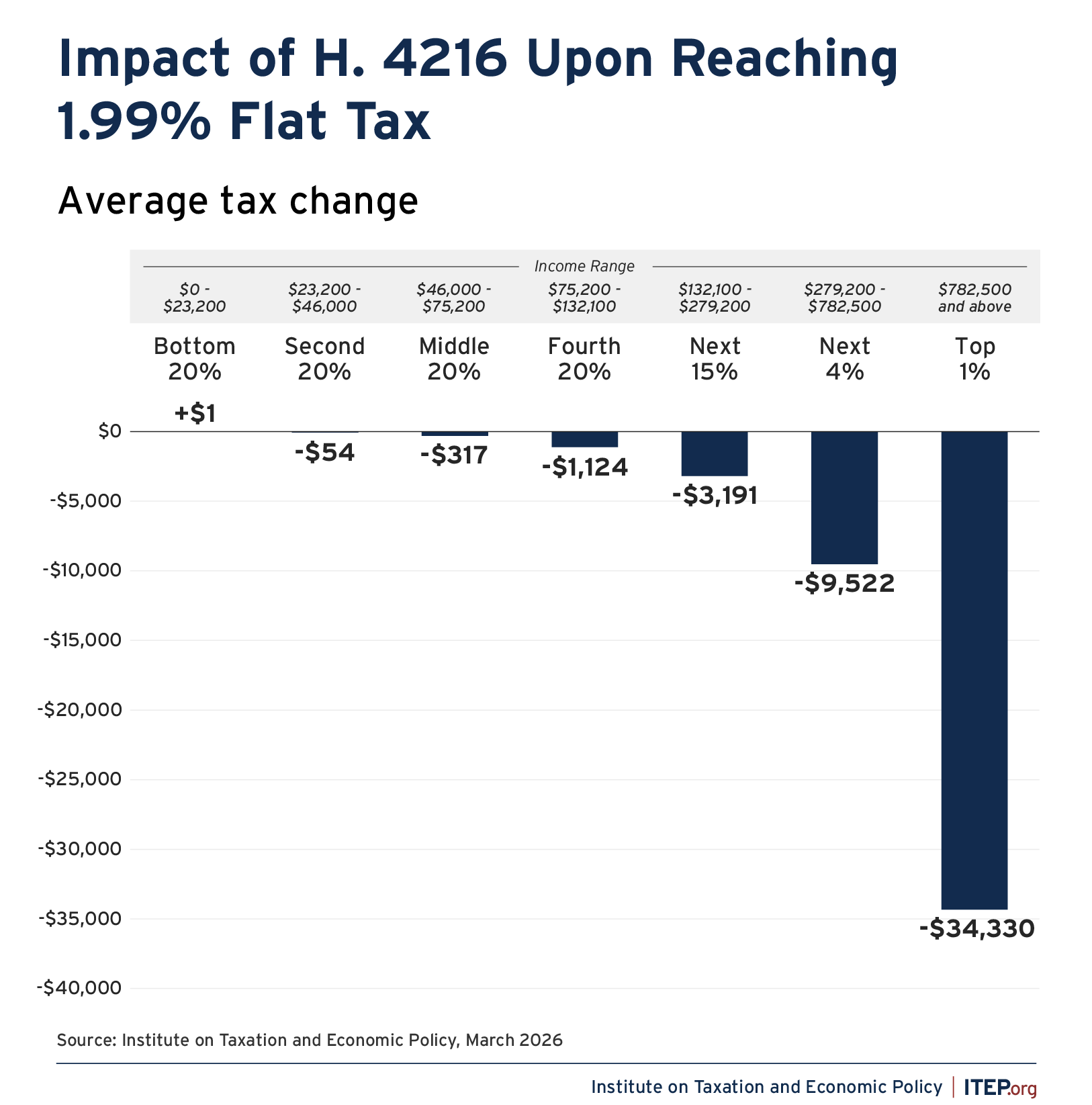 When the brackets collapse into a 1.99 percent flat rate, the revenue loss jumps to $4.3 billion a year, according to ITEP modeling, with the bottom 20 percent continuing to receive no tax cut and the top 1 percent of South Carolinians seeing a $34,330 average annual tax cut. As a percentage of income, this amounts to a tax cut for the wealthiest South Carolinians that is four times larger than middle-class families receive.