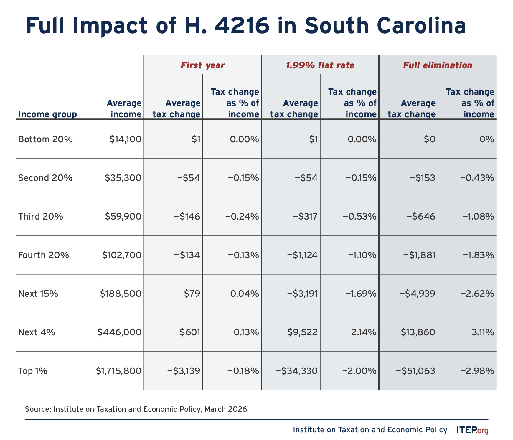 South Carolina’s H 4216, recently signed into law, is a regressive tax cut that will disproportionately benefit the state’s highest-income residents while simultaneously jeopardizing the state’s ability to pay for basic public services in the years to come.