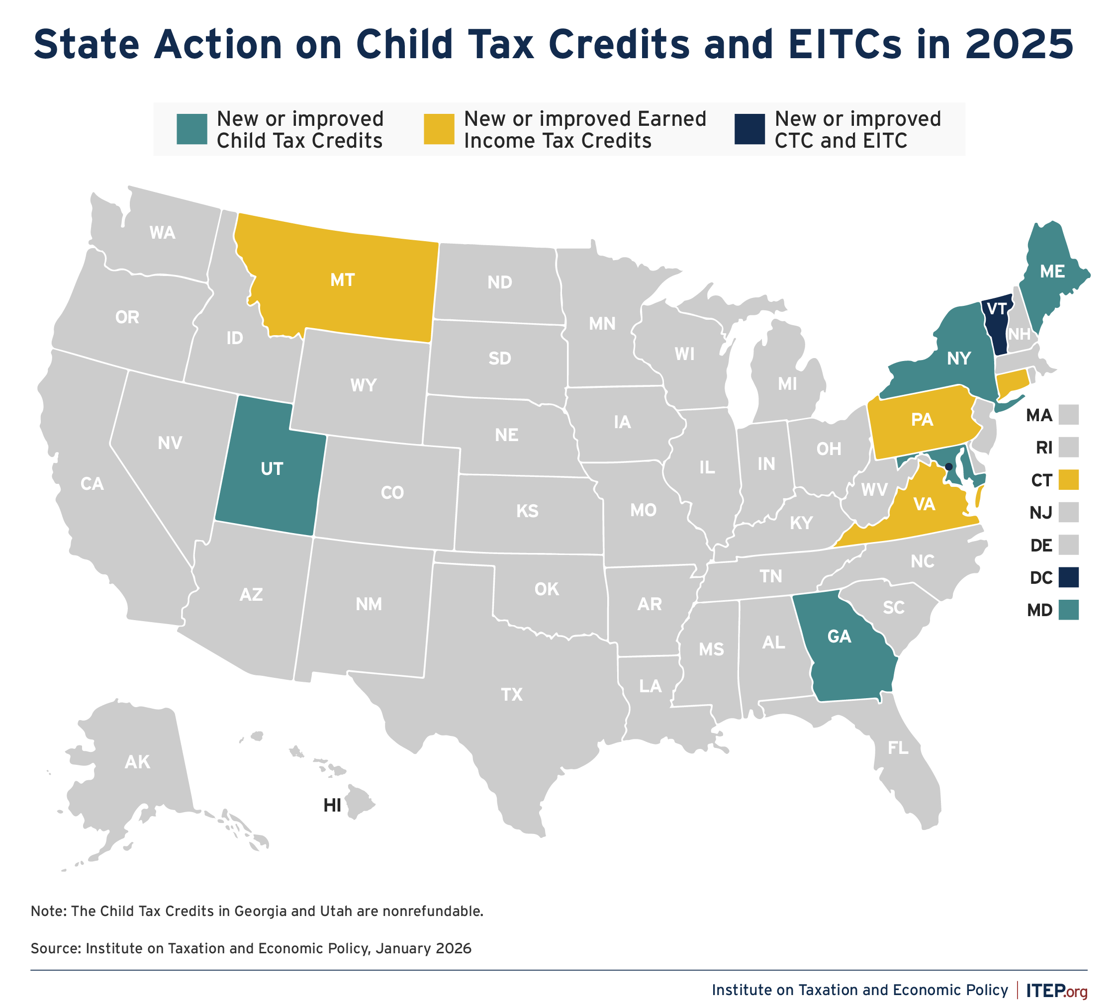 Refundable tax credits were a big part of state tax policy conversations this year, as lawmakers sought to boost incomes, make their tax systems less regressive, and improve economic stability for working families and families with children. In 2025, nine states improved or created Child Tax Credits (CTC) or Earned Income Tax Credits (EITC).