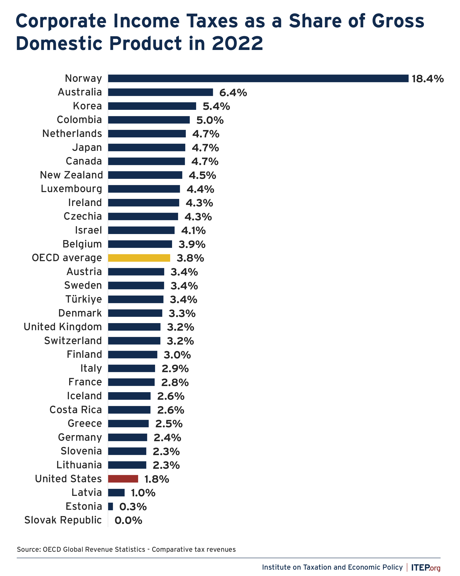 In 2022, the most recent year for which the OECD has complete data, only three member countries collected less corporate tax revenue, as a share of their gross domestic product, than the U.S.: Latvia, Estonia, and the Slavic Republic. Meanwhile, the average OECD country collected more than twice as much corporate tax revenue as a share of GDP as the U.S. (3.8 percent vs 1.8 percent).