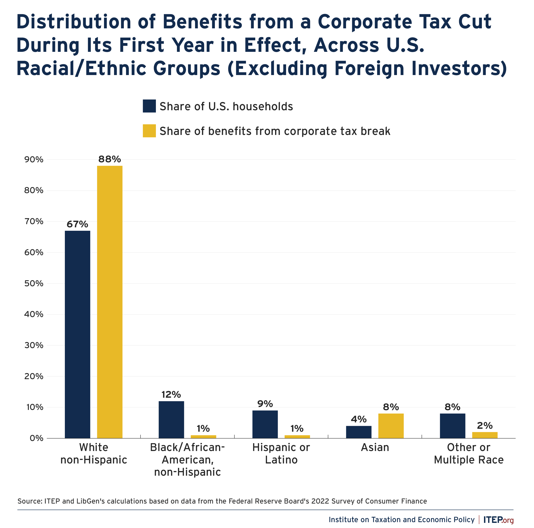 Because the wealthiest Americans who disproportionately own most corporate stocks are disproportionately white, white Americans as a group receive a disproportionate share of the benefits to U.S. households when corporations pay less in taxes. Black and Hispanic households each receive just 1 percent of the benefits to U.S. households despite making up 12 percent and 9 percent of U.S. households, respectively. Corporate tax breaks and corporate tax avoidance clearly worsen racial inequality within the U.S.